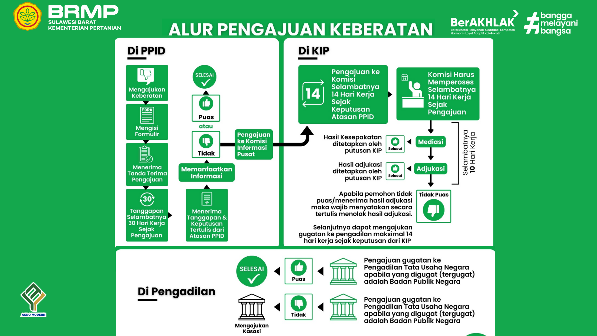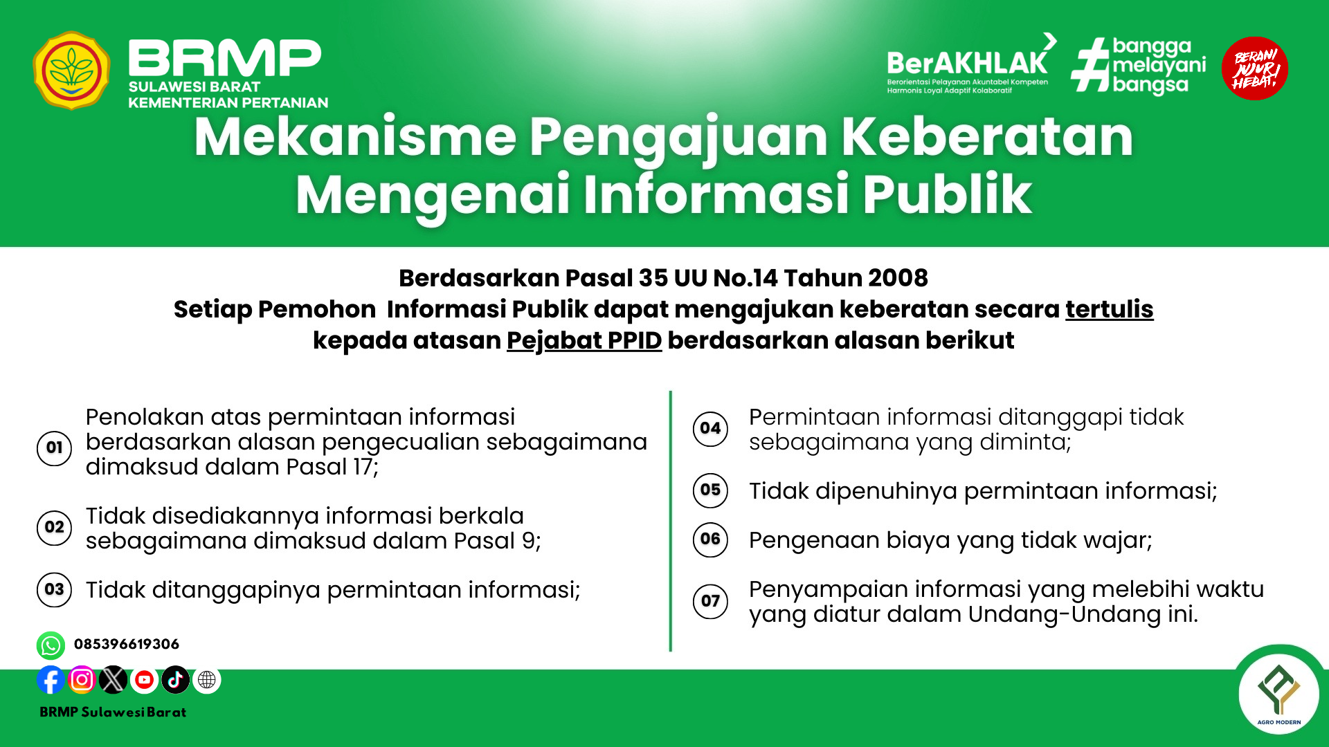 Setiap pemohon informasi publik dapat mengajukan keberatan secara tertulis kepada atasan Pejabat Pengelola Informasi dan Dokumentasi dengan alasan sebagaimana ditetapkan dalam pasal 35 Undang-Undang Nomor 14 Tahun 2008. Keberatan diajukan oleh Pemohon Informasi Publik dalam jangka waktu paling lambat 30 (tiga puluh) hari kerja setelah yang bersangkutan menemukan alasan keberatan.